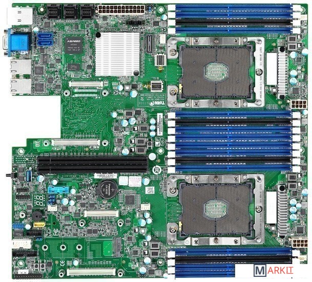 На задней панели располагается RJ-45, который является выделенным портом управления.Плата оснащена двумя слотами PCI Express x24, которые служат для установки высокоскоростных дисковых и сетевых контроллеров посредством соответствующей райзер-карты.