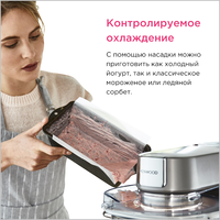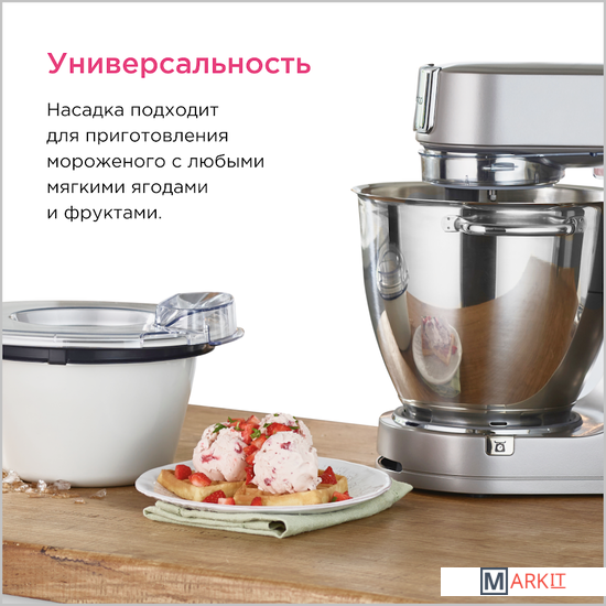 Насадка может удобно расположиться внутри чаши вашего Kenwood Chef и укомплектована всем необходимым, включая чашу для предварительного замораживания, лопатку для смешивания и переходник для чаши.