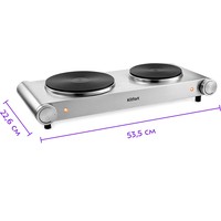 Максимальная нагрузка: 10 кг.Длина шнура питания: 1 м.Общая мощность: 2200-2500 Вт - левая конфорка: 1350-1500 Вт; - правая конфорка: 850-1000 Вт.