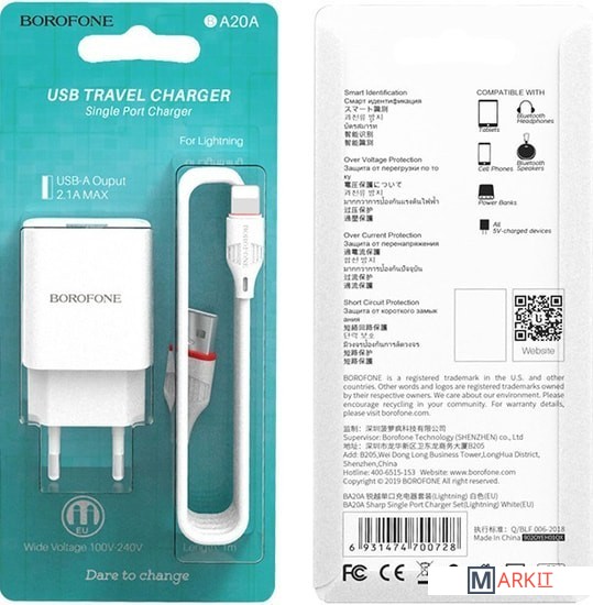 Markit » Зарядные устройства » Сетевое зарядное Borofone BA20A Lightning (белый)